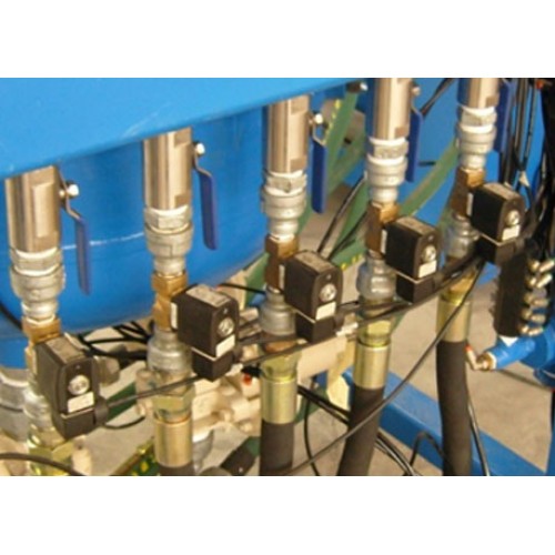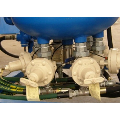 Large pressure pots provide abrasives for blast guns twisting in both clockwise and anti-clockwise manner.