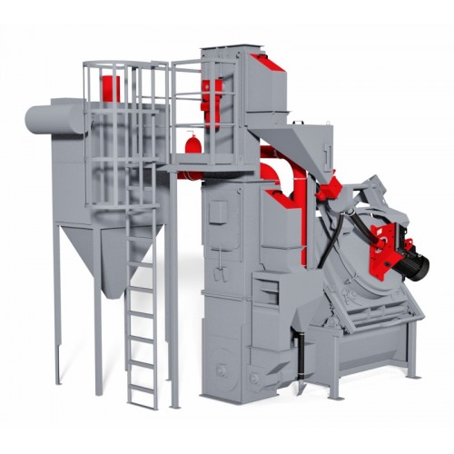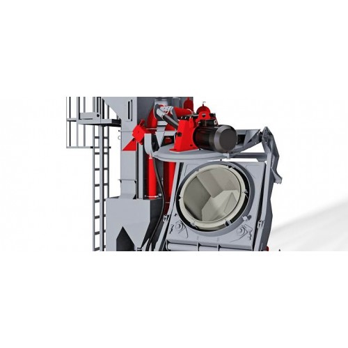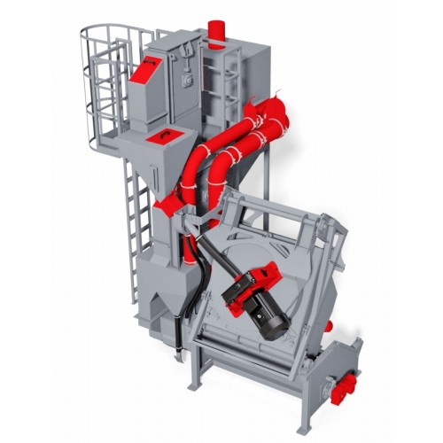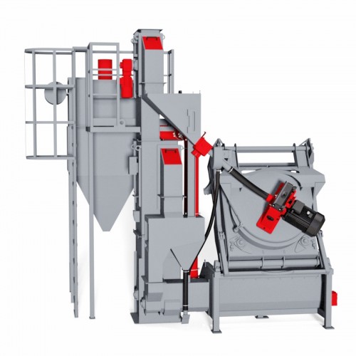 During emptying the machine, the treated workpieces may fall into the crates or vibratory conveyor that locates between the machine and the hydraulic loader. The wheel is mounted on the cover of the drum in order to perform greater efficiency of blasting.